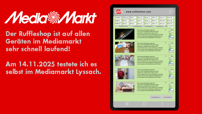 Die neuen Kernels des Ruffleshops sind sehr aktuell. Diese sind mit der ganzen Welt kompatibel. A4Web Langenthal bietet bei jedem Kauf zwei zusätzliche Startlinks an zu beiden Kernels, die auf jedes Gerät der Welt passen und den Ruffleshop auf 100% Breite und 100% Höhe automatisch skalieren in einem A4-Seitenverhältnis (750 Pixel mal 1100 Pixel als Basisprogrammierung des Ruffle Containers). Der Ruffleshop ist in allen Währungen erhältlich, drei werden zum Discountpreis angeboten 375 USD, 375 Euro und 375 CHF (Schweizer Franken). Die Geräte, die den Ruffleshop anzeigen können, sind erst in den letzten drei, vier Jahren auf dem Markt erhältlich. Entscheidend ist ein starker Prozessor, der eine schnelle Vektorgrafik berechnen kann (Video- und Gamingauflösung in den Displays der heutigen Zeit).