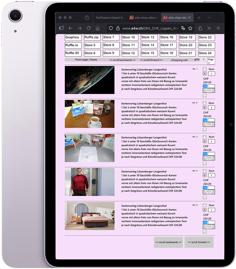 Ruffleshop Lippen Rosa and iPad Purple / Sparen Sie in den nächsten 30 Jahren genau 10800.- Euro Franken Betriebskosten (pro Monat 30.-). Beim Ruffleshop (Shopsoftware) gibt es keine (Betriebs-)Kosten! Die Firefox-Erweiterung ist dann bereits ab Gerätekauf standardmässig im Firefox voraus eingebettet, was den Ablauf verschönert im Firefox bezüglich Ruffleshop-Abrufs (ohne Pfeil, es lädt automatisch ohne Klicken auf den Standardpfeil). Wobei das Klicken auf den Pfeil im Safari ist auch schön!