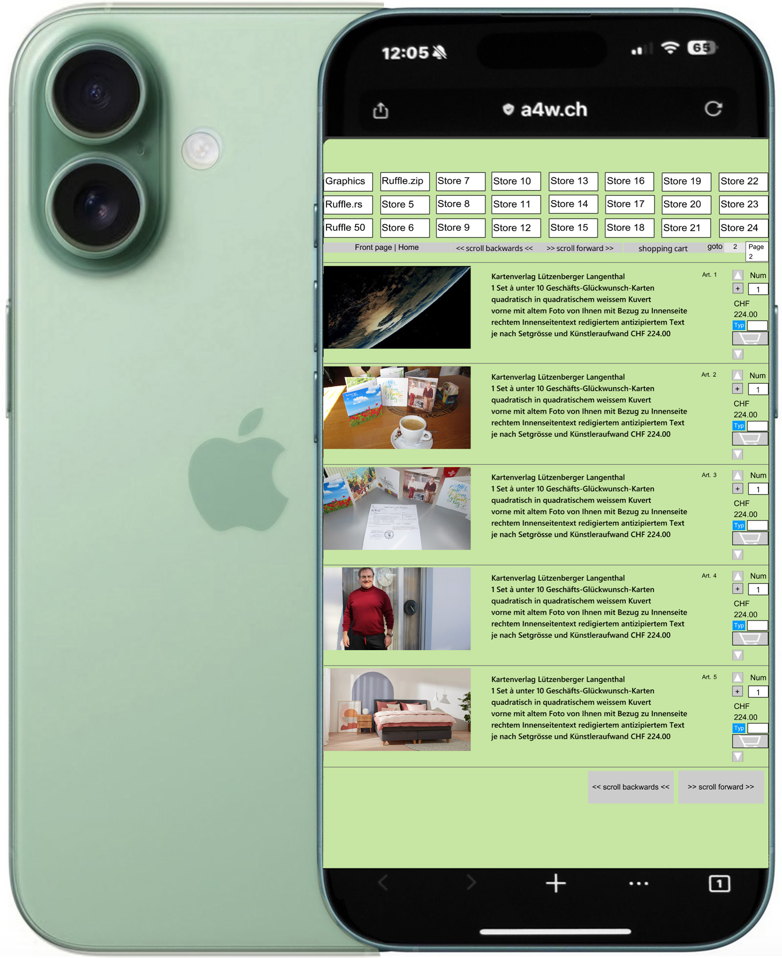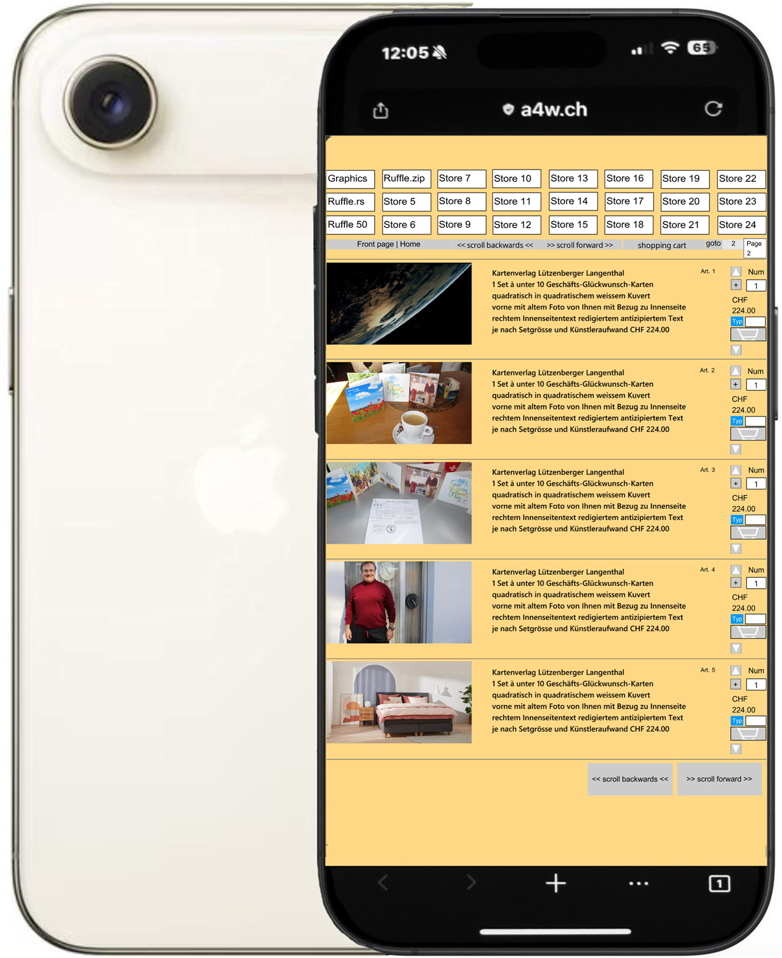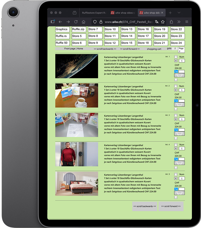 Ruffleshops haben 30 Jahre lang keine Betriebskosten nach dem Abkauf und sind überall abrufbar auf jedem Gerät der Welt und man kann jede Sprache der Welt ins Content eintippen. Besonders handlich sind diese auf den Desktop-Computern. Siehe Mustershops in den Verkaufsportalen in Dollar, Euro oder CHF und in allen Farben abrufbar. Der Ruffleshop öffnet sich auf allen Geräten der Welt im Hochformat auf alle Displays mit 100% Breite und 100% Höhe automatisch in Full-HD-Qualität. 87 Der Ruffleshop ist ein modernes Hologramm der heutigen Zeit