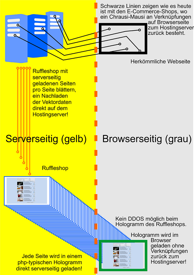 Nur der Warenkorb geht aber verschlüsselt zurück zum Hostingserver beim Ruffleshop, wo unser Kunde bestimmen kann, welche Autoresponder oder Bezahlfutures eingesetzt werden mit dem übermittelten Totalbetrag des Warenkorbes und der E-Mailadresse mitsamt Adresse des Shopbesuchers. Sonst besteht beim Ruffleshop-Hologramm bei jedem Blättern ein serverseitiges Nachladen einzelnder Seiten. Was den Shop zu herkömmlichen Seiten DDOS-sicherer macht und generell hacksicher. Der Ruffleshop ist der sichererste E-Commerce-Shop der Welt. Mit verschlüsseltem Server-PHP serverseitig ablaufendem Warenkorb.