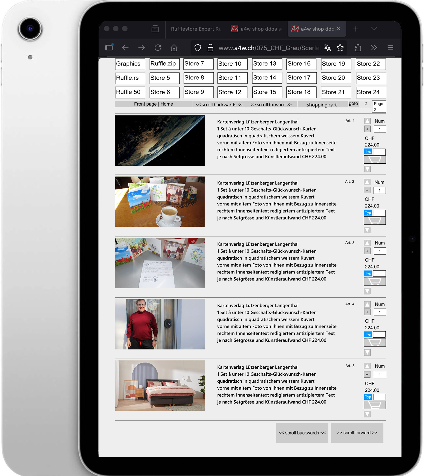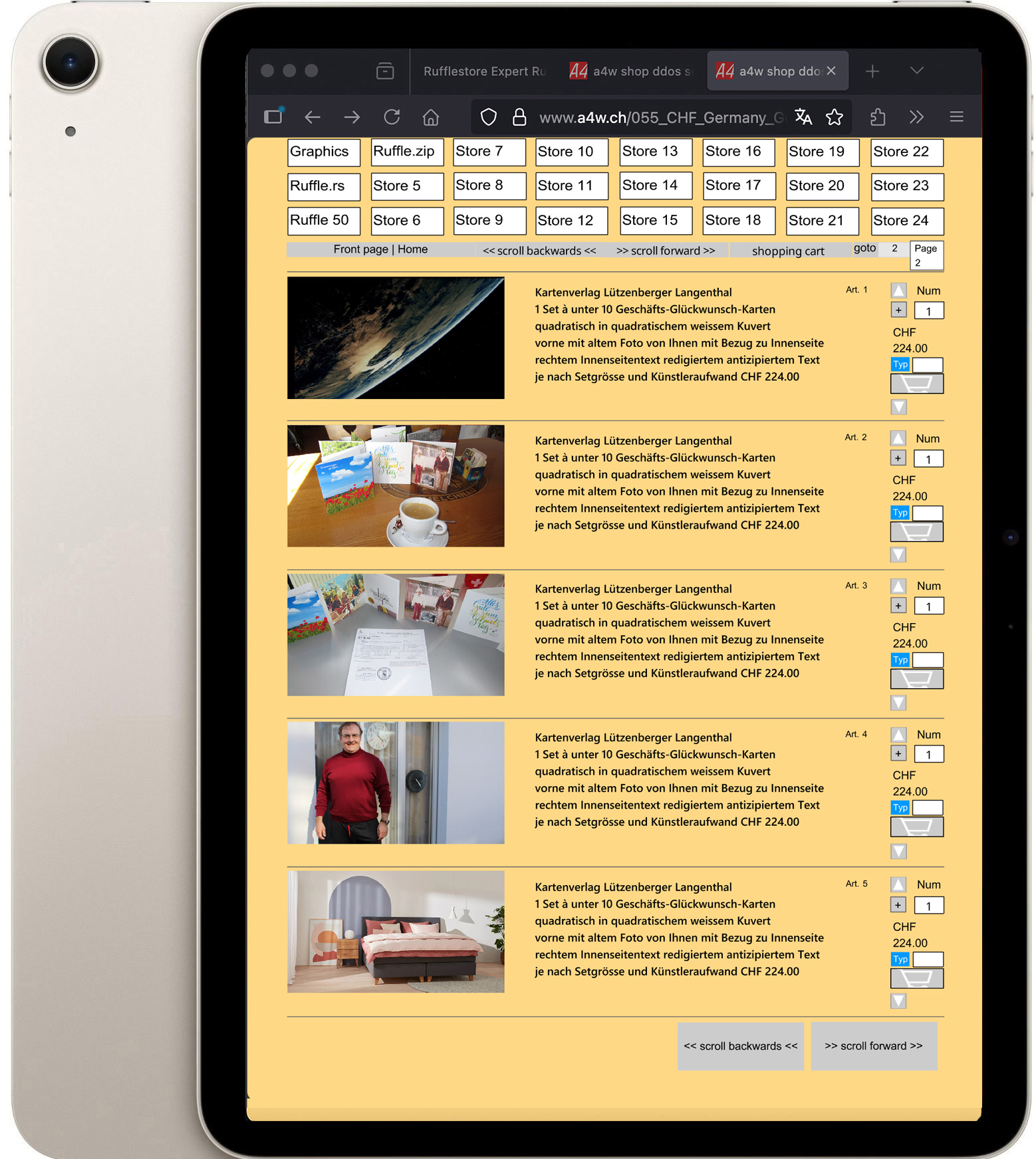 Ruffleshops haben 30 Jahre lang keine Betriebskosten nach dem Abkauf und sind überall abrufbar auf jedem Gerät der Welt und man kann jede Sprache der Welt ins Content eintippen. Besonders handlich sind diese auf den Desktop-Computern. Siehe Mustershops in den Verkaufsportalen in Dollar, Euro oder CHF und in allen Farben abrufbar. Der Ruffleshop öffnet sich auf allen Geräten der Welt im Hochformat auf alle Displays mit 100% Breite und 100% Höhe automatisch in Full-HD-Qualität. 87 Der Ruffleshop ist ein modernes Hologramm der heutigen Zeit