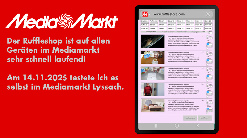Die neuen Kernels des Ruffleshops sind sehr aktuell. Diese sind mit der ganzen Welt kompatibel. A4Web Langenthal bietet bei jedem Kauf zwei zusätzliche Startlinks an zu beiden Kernels, die auf jedes Gerät der Welt passen und den Ruffleshop auf 100% Breite und 100% Höhe automatisch skalieren in einem A4-Seitenverhältnis (750 Pixel mal 1100 Pixel als Basisprogrammierung des Ruffle Containers). Der Ruffleshop ist in allen Währungen erhältlich, drei werden zum Discountpreis angeboten 375 USD, 375 Euro und 375 CHF (Schweizer Franken). Die Geräte, die den Ruffleshop anzeigen können, sind erst in den letzten drei, vier Jahren auf dem Markt erhältlich. Entscheidend ist ein starker Prozessor, der eine schnelle Vektorgrafik berechnen kann (Video- und Gamingauflösung in den Displays der heutigen Zeit).