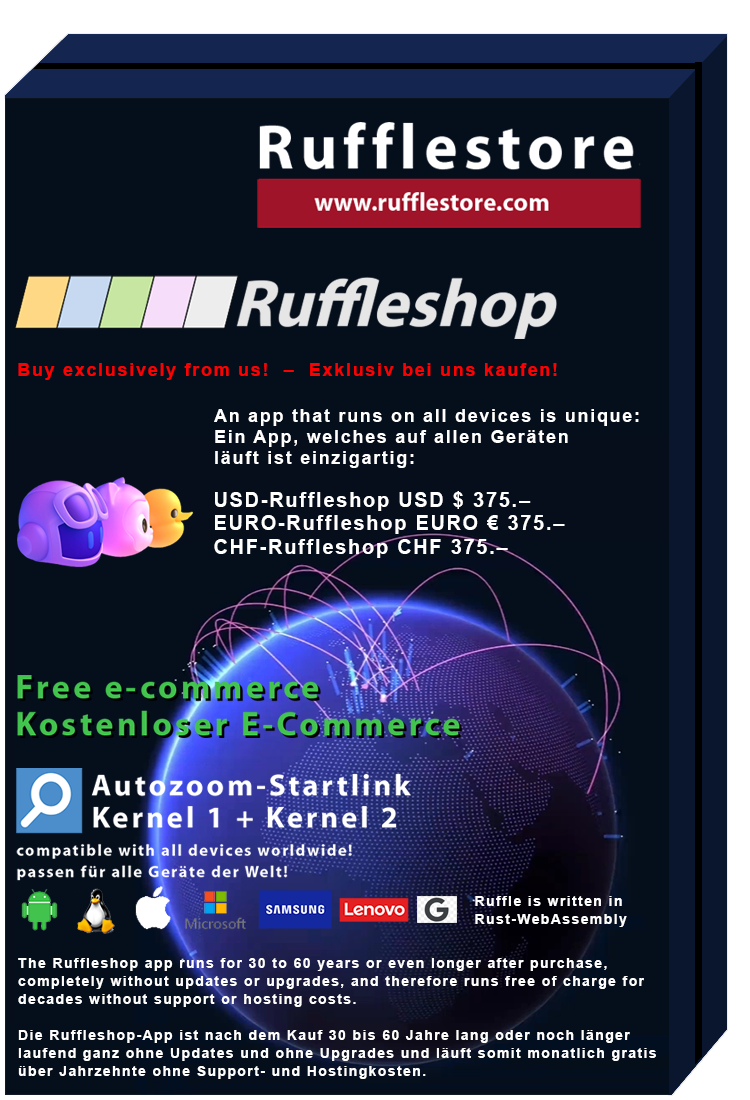 Die neuen Kernels des Ruffleshops sind sehr aktuell. Diese sind mit der ganzen Welt kompatibel. A4Web Langenthal bietet bei jedem Kauf zwei zusätzliche Startlinks an zu beiden Kernels, die auf jedes Gerät der Welt passen und den Ruffleshop auf 100% Breite und 100% Höhe automatisch skalieren in einem A4-Seitenverhältnis (750 Pixel mal 1100 Pixel als Basisprogrammierung des Ruffle Containers). Der Ruffleshop ist in allen Währungen erhältlich, drei werden zum Discountpreis angeboten 375 USD, 375 Euro und 375 CHF (Schweizer Franken). Die Geräte, die den Ruffleshop anzeigen können, sind erst in den letzten fünf, sechs Jahren auf dem Markt erhältlich. Entscheidend ist ein starker Prozessor, der eine schnelle Vektorgrafik berechnen kann (Video- und Gamingauflösung in den Displays der heutigen Zeit).